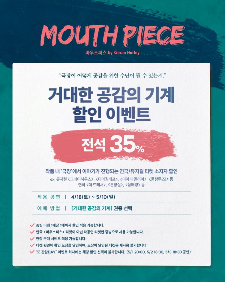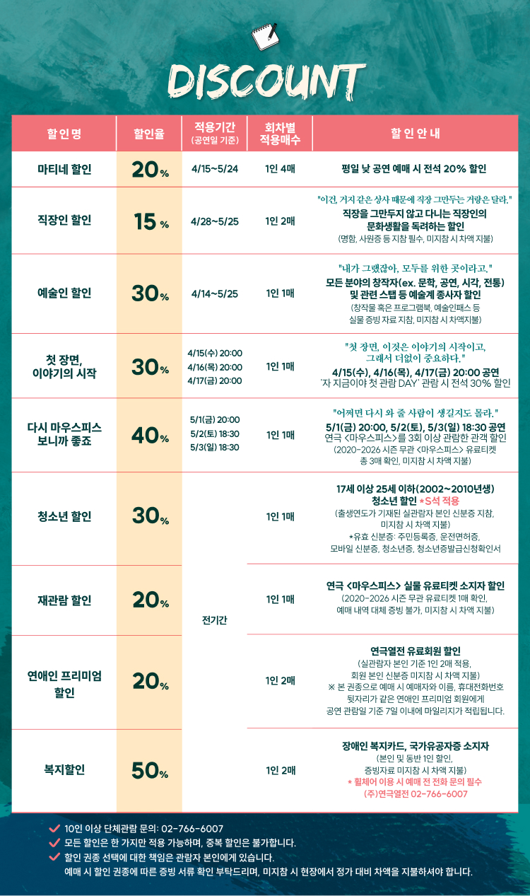 화, 수, 금 8시 / 수 4시, 8시 / 토, 일 및 공휴일 3시, 6시 30분(월 쉼)