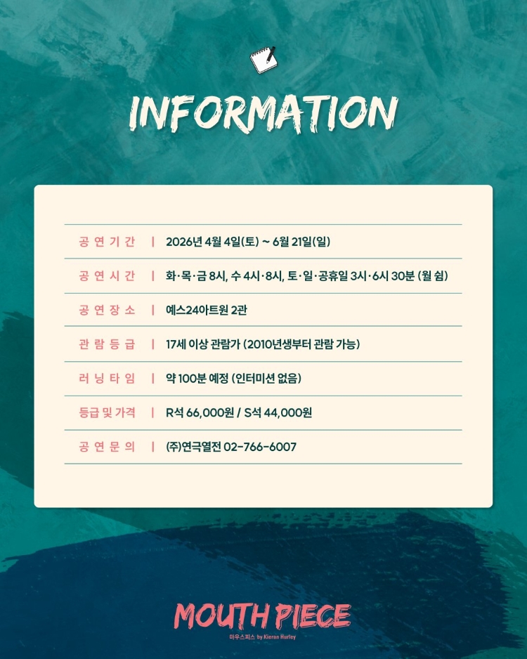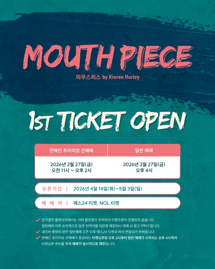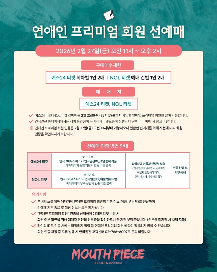 | [연극열전10] 여덟 번째 작품 <마우스피스> 1차 티켓오픈 안내 - 2/27(금) 선예매 11:00 / 일반예매 16:00 |