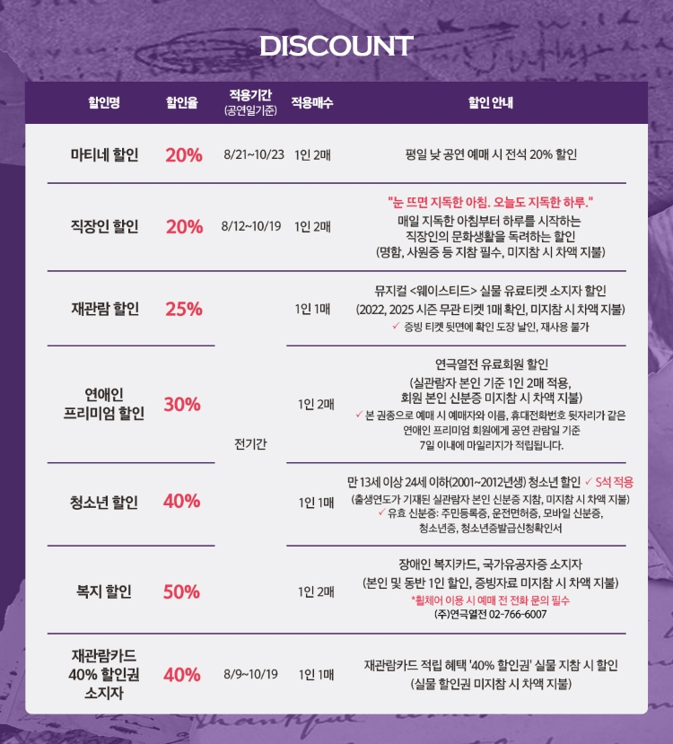 화, 수, 금 8시 / 목 4시, 8시 / 토 3시, 7시 / 일, 공휴일 2시, 6시 (월 공연 없음)
