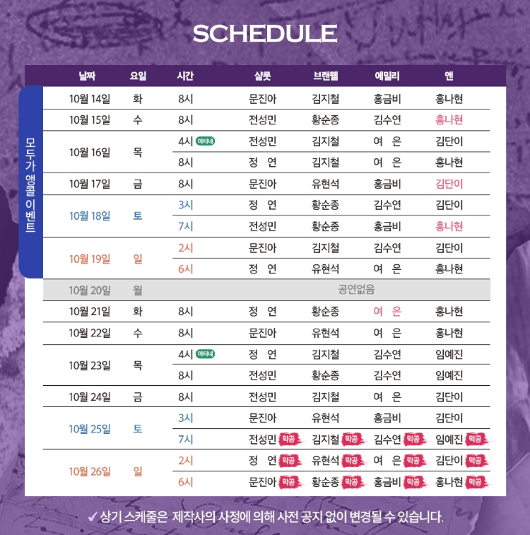 화, 수, 금 8시 / 목 4시, 8시 / 토 3시, 7시 / 일, 공휴일 2시, 6시 (월 공연 없음)