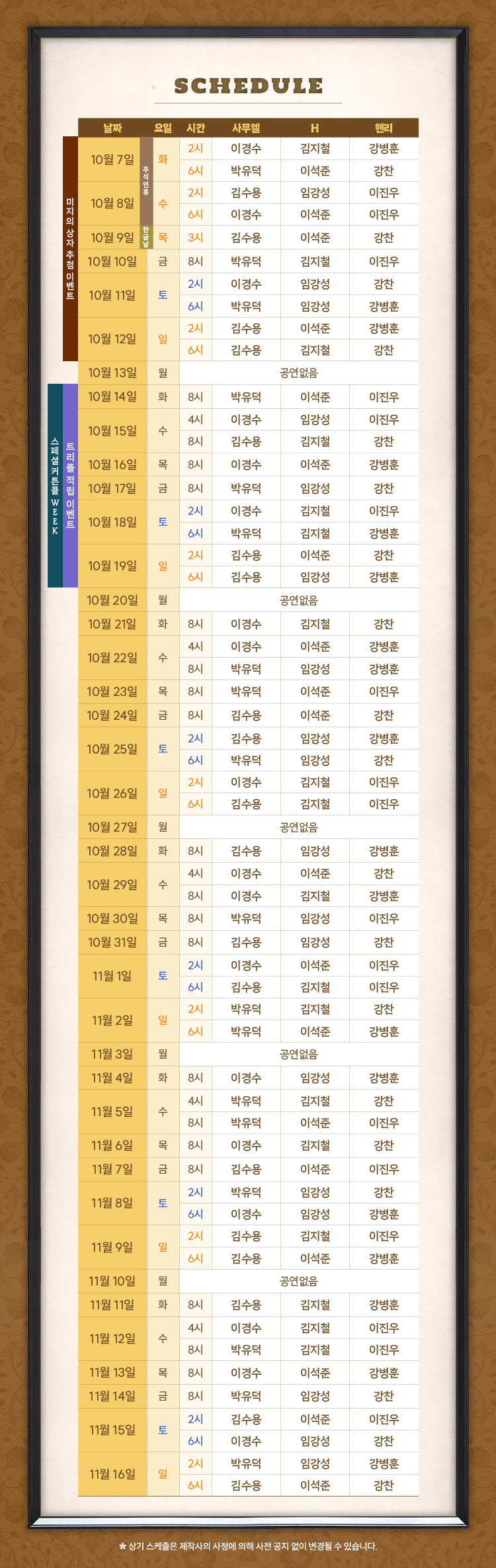 화, 목, 금 8시 / 수 4시, 8시 / 토. 일, 공휴일 2시, 6시 (월 공연 없음)