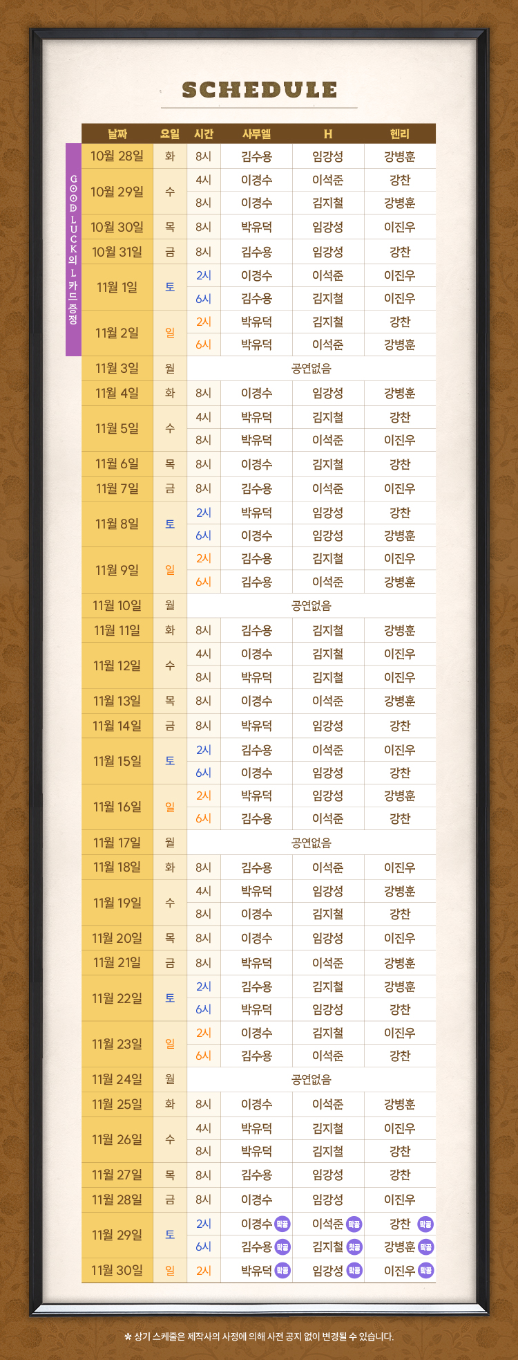 화, 목, 금 8시 / 수 4시, 8시 / 토. 일, 공휴일 2시, 6시 (월 공연 없음)