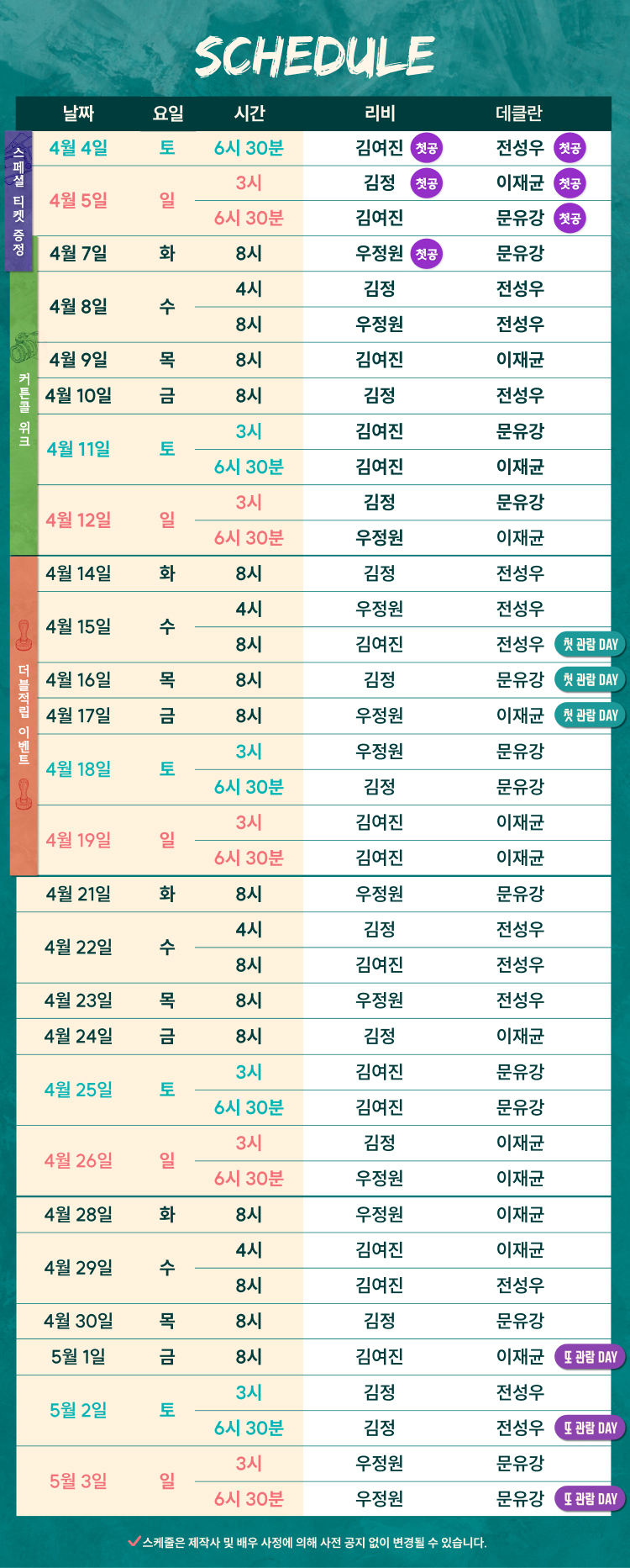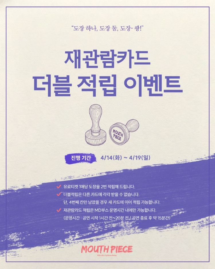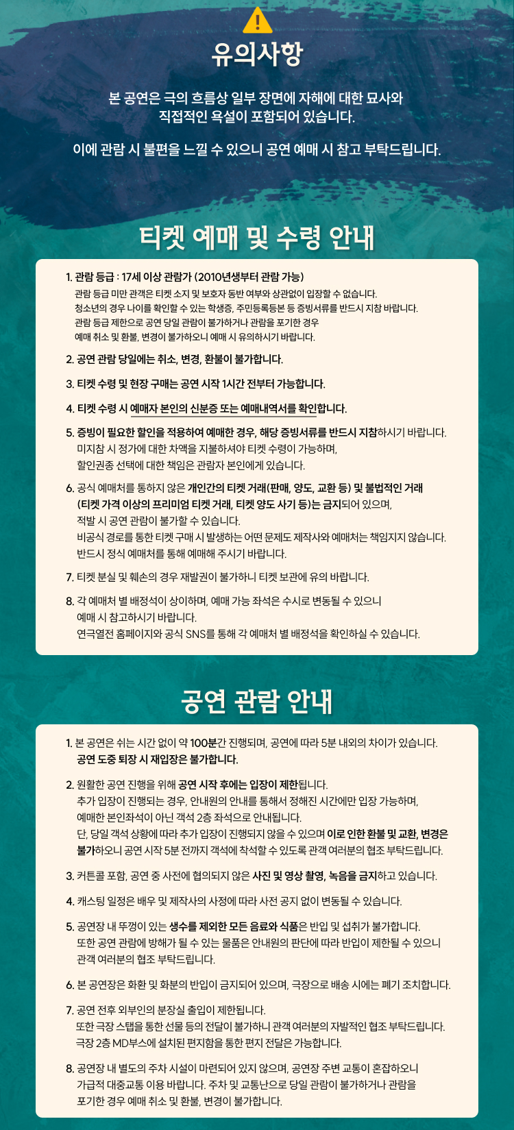 화, 수, 금 8시 / 수 4시, 8시 / 토, 일 및 공휴일 3시, 6시 30분(월 쉼)