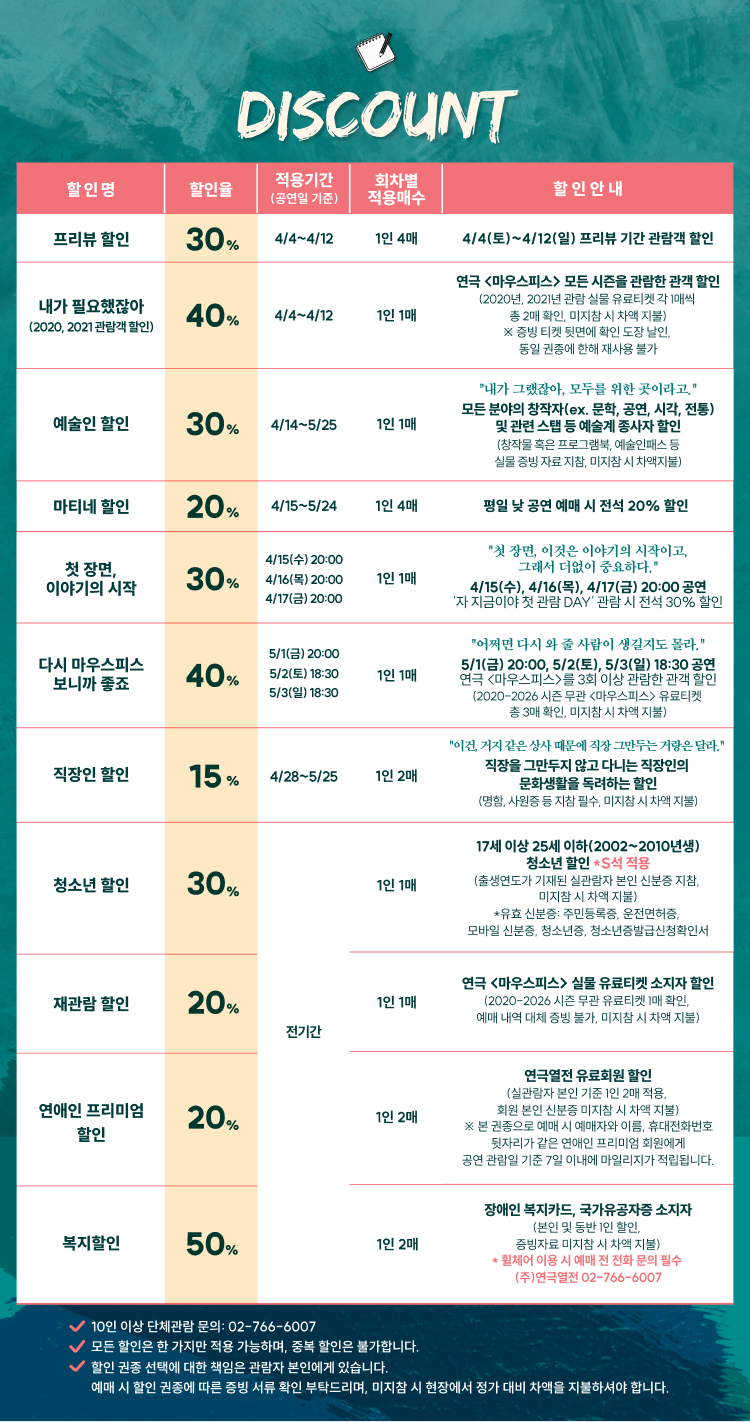 화, 수, 금 8시 / 수 4시, 8시 / 토, 일 및 공휴일 3시, 6시 30분(월 쉼)