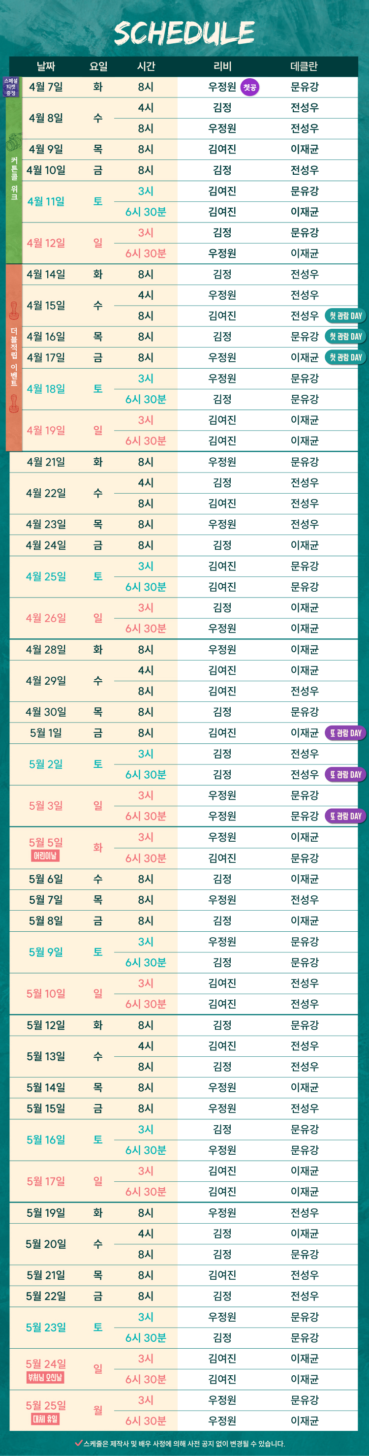 화, 목, 금 8시 / 수 4시, 8시 / 토. 일, 공휴일 3시, 6시 30분 (월 공연 없음)