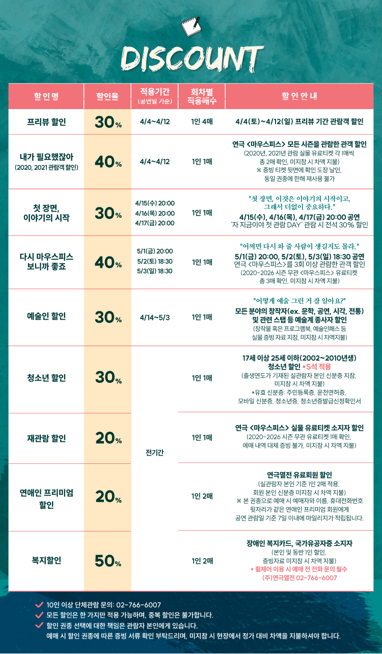 화, 목, 금 8시 / 수 4시, 8시 / 토. 일, 공휴일 3시, 6시 30분 (월 공연 없음)
